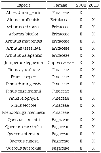 En la totalidad de las parcelas se registraron 20 especies, pertenecientes a cinco familias y siete géneros. El género Pinus presentó la mayor riqueza con seis especies; la distribución de este se encuentra en todo el sistema montañoso del país (García y González, 1998). López-Hernández et al. (2017) y Graciano Ávila et al. (2020) registraron que Pinus tiene mayor abundancia en bosques templados de Puebla y Durango. en el presente estudio, los géneros Quercus y Arbutus estuvieron presentes con cinco especies cada uno (Tabla 1). De las 20 especies observadas en los dos inventarios solo se comparten 17, ya que Abies durangensis y Pinus engelmannii se registraron en 2008 pero no se encontraron en 2013. En ese mismo año se observó presencia de Pseudotsuga menziesii, que fue ausente en 2008. La presencia o ausencia de especies en uno u otro año de medición posiblemente se debe a la poca abundancia absoluta (número de árboles por hectárea) y a que están sujetas a una mayor competencia y alto índice de mortalidad.