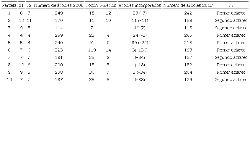 Para las parcelas muestreadas, en la tabla 2 se presenta el número de especies registradas en los dos años de muestreo (S1 y S2), el número de árboles, el de tocones, el de individuos muertos en pie o caídos, el de árboles incorporados y el tratamiento silvícola que se aplicó a cada parcela. La parcela 3 presentó un aumento en el número de sus individuos (+2), las parcelas restantes presentaron reducción de su número de árboles; las parcelas con mayor remoción de arbolado fueron 5 y 6, con 91 y 119 individuos, respectivamente; en cambio, la parcela 5 presentó mayor número de individuos de regeneración con 69 incorporaciones.
