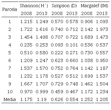 En la tabla 3 se muestran los valores para los diferentes índices de diversidad evaluados. En la parcela 4 el índice de Shannon (𝐻´) presentó los valores más bajos; esto se debe a que existe dominancia de una especie (P. cooperi) respecto a las demás (𝐻´ = 0.235 en 2008 y 𝐻´= 0.253 en 2013). Solís Moreno et al. (2006) encontraron valor de 𝐻´ = 0.72 en una parcela con manejo de aclareos y 𝐻´= 1.21 en una parcela manejada por el método de selección; la parcela 2 presentó el valor más alto en 2008 (𝐻´= 1.722), pero su valor se redujo en 2013 (𝐻´=1.616). En cambio, la parcela 9 presentó el valor más alto en 2013 (H́ = 1.707), que es mayor al calculado en 2008 (𝐻´=1.667). La aplicación del tratamiento de aclareos favorece de forma significativa el hecho de que el género Pinus se torne dominante, ya que las cortas van dirigidas a aquellas especies con menor valor comercial (Solís Moreno et al., 2006).