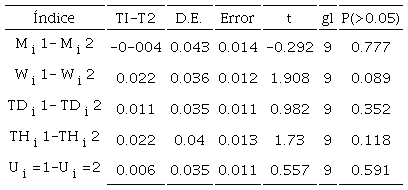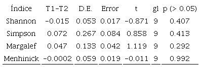 Para evaluar si los índices utilizados en este trabajo suponen una diversidad y estructura significativamente diferente entre mediciones se aplicó una prueba de comparación de medias dependientes (t de Student) considerando 95% de nivel de significancia. La evaluación se realizó comparando la media de los diferentes índices utilizando el programa estadístico SAS (SAS, 2009).
