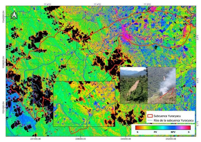 En campo, se realizó el recorrido por la margen izquierda de la subcuenca para conocer el estado actual de los puntos establecidos, donde se identificaron problemas de quema, tala y desbroce de bosques. La evaluación se realizó el 27 de agosto de 2018 en coordinación con la División de Medioambiente de la Municipalidad Distrital de Nueva Cajamarca (Fig. 11). En la figura 11 se pueden observar pixeles en color rojo, que corresponden al sustrato expuesto; igualmente se distinguen los de color verde que corresponden a la vegetación fotosintéticamente activa y representan el bosque tropical de la subcuenca (parte alta de la cuenca). En la parte baja de la subcuenca en las proximidades de la red hídrica, cerca de la confluencia del río Yuracyacu con el río Mayo, pueden observarse pixeles de color azul hasta morados, lo que entra en la clasificación de vegetación no fotosintética hasta llegar al sustrato expuesto, es decir, corresponde a tierras que han sufrido cambio de uso de suelo. Finalmente, los pixeles con tonalidades amarillentas - anaranjadas se han identificado como tierras agrícolas o pasturas muy cerca de las localidades de La Florida en Nueva Cajamarca.