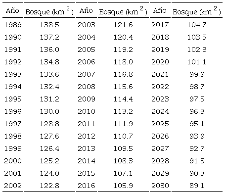 Se consideró conveniente realizar las proyecciones de las áreas boscosas hasta el año 2030, debido a que hacer mayores proyecciones conlleva a incrementar el error de estimación.