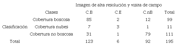 La fiabilidad global de los mapas de cobertura boscosa fue 86% para las imágenes Landsat TM, este resultado se encuentra dentro de los límites aceptables usados en estudios donde se emplean técnicas de teledetección en la interpretación de imágenes de satélite (Osorio, Mas, Guerra y Maass, 2015).