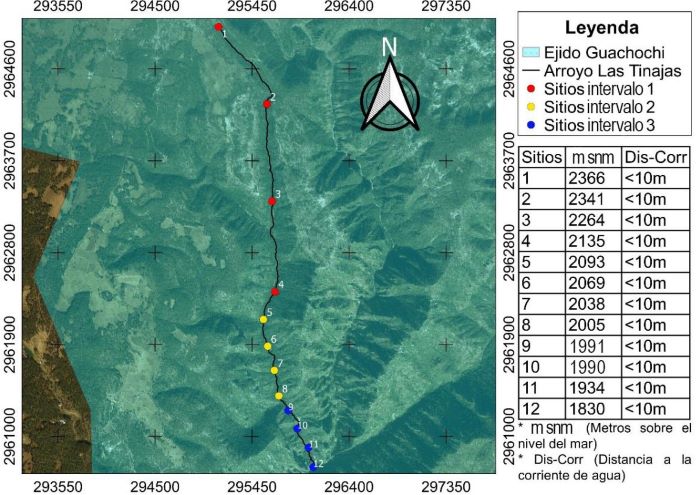 El área de estudio corresponde al arroyo Las Tinajas, que se encuentra en la región suroeste del estado de Chihuahua en lo que se conoce como Alta Sierra Tarahumara, dentro del Ejido Guachochi, perteneciente al municipio Guachochi. La corriente superficial del arroyo fue clasificada como intermitente según el portal del Instituto Nacional de Estadística y Geografía [Inegi] (2020). Las coordenadas extremas superior son 295107.94 E, 2965024 N e inferior 296108 E, 2960697 N (Fig. 1). Se caracteriza por tener un clima templado con temperaturas medias anuales de alrededor de 15 °C y precipitaciones medias entre 500 mm y 1000 mm anuales (García et al., 2009).