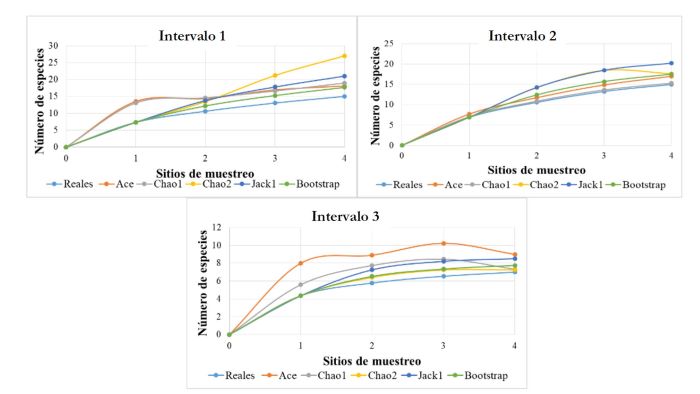 Mediante las curvas de acumulación de especies y los modelos utilizados, se observó que el esfuerzo de muestreo realizado consiguió en promedio una representatividad de 74.79% de la riqueza específica de especies para el intervalo 1, 86.16% para el intervalo 2 y 88.48% para el intervalo 3; con base a los estimadores Chao1, ACE, Chao2, Jacknife1 y Bootstrap (Fig. 2).