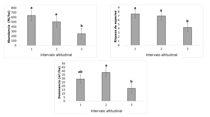 En la comparación de medias (Fig. 5), para los intervalos de altitud, se obtuvo que la abundancia presentó tendencia de disminución en el número de individuos por hectárea conforme al descenso del nivel altitudinal, presentando diferencia significativa únicamente el intervalo 3 (p < 0.05) comparado con el 1 (p = 0.005) y con el 2 (p = 0.50); se presentó la misma tendencia para la riqueza de especies obteniendo en la comparación intervalo 1-3 (p = 0.17) y intervalo 2-3 (p = 0.040). La variable de dominancia no presentó alguna tendencia de aumento o disminución conforme al nivel altitudinal. El intervalo 2 presentó el mayor valor de área basal (38.3 m2 por hectárea); en este indicador, la diferencia significativa se presentó en el intervalo 2 en comparación con el 3 (p = 0.031).
