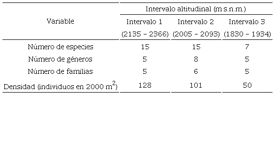 En el intervalo 1 se registraron cinco familias que comprenden a cinco géneros, 15 especies y 128 individuos; para el intervalo 2, seis familias, ocho géneros, 15 especies y 101 individuos; para el intervalo 3, cinco familias, cinco géneros, siete especies y 50 individuos. En total, se registraron 279 individuos de árboles y se identificaron 18 especies pertenecientes a ocho géneros y seis familias (Tabla 1)