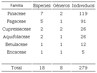Sobre la densidad, Pinaceae contribuyó con 42.65% seguida de Fagaceae (32.62%), Cupressaceae (9.32%), Aquifolaceae (9.32%), Betulaceae (4.30%) y Ericaceae con 1.79% (Tabla 2).