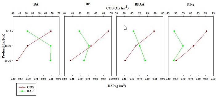 En este estudio, el contenido de carbono orgánico almacenado en suelo tuvo diferencias significativas tanto espacialmente (BA, BP, BPAA y BPA), como entre profundidades del suelo (P<0,05). Lo anterior, ocurre por la interacción de procesos geomórficos y bióticos, la variabilidad espacial del COS, la profundidad del suelo o la densidad aparente (González-Molina, Etchevers-Barra y Hidalgo-Moreno, 2008).