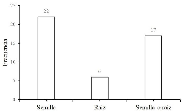 Así, 81% de los entrevistados reconocen las formas de reproducción del laurel, 49% solo por semilla, 13% por raíz, a través de rebrotes o bien por siembra, 38% mencionó que su reproducción se puede dar de ambas formas. Existen otras características del laurel que la gente identifica, tales como el sexo de los individuos. Veintinueve por ciento de los actores mencionó que existe una hembra y un macho y la forma de reconocerlo es a través de la producción de la flor, la semilla y por el tamaño de la planta (Fig. 3).