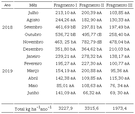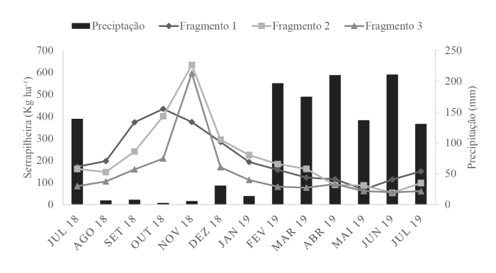 Como pode ser observado, os três fragmentos seguiram o mesmo padrão de sazonalidade, onde a maior quantidade de material depositado sobre o piso florestal concentrase entre os meses de setembro a novembro de 2018, o que está associado, diretamente, ao período com menor precipitação pluviométrica (Fig. 1).