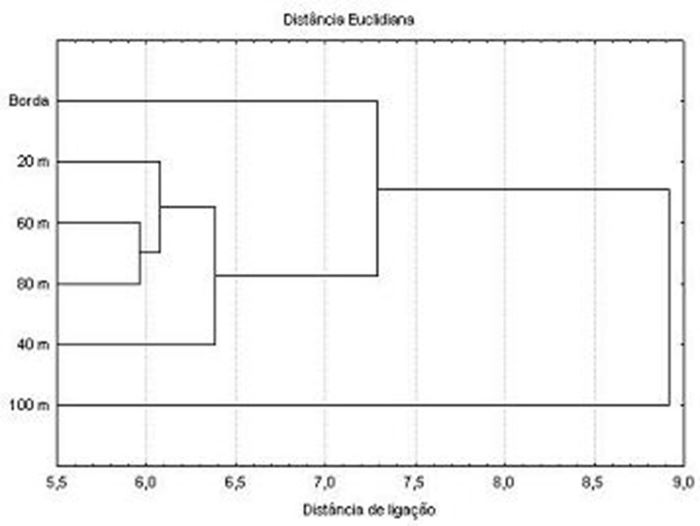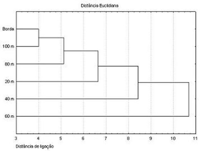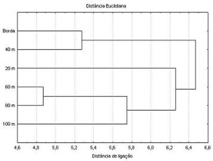 Em termos de similaridade, foi possível notar que os resultados se dividem em dois grupos, o primeiro corresponde aos valores obtidos na borda até os 80 m e, o segundo grupo, composto somente pelos 100 m. O que significa que o primeiro grupo, apresenta maior semelhança, sendo a menor distância euclidiana entre os 60 m e 80 m. E o segundo grupo apresenta os dados com maior dissimilaridade em relação aos demais, por ser o último conjunto de dados a se agrupar, no entanto, ainda que apresente maior distância, estatisticamente, não houve diferença significativa com relação aos demais.