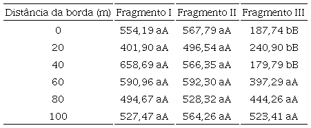 Sobre deposição da serapilheira no gradiente borda e interior, verificase que, para os fragmentos I e II, não há diferenças estatísticas, porém, havendo apenas para o fragmento III, onde, nas distâncias entre 60 m e 100 m, há uma maior taxa de deposição (1364,96 kg ha-1ano-1) e, da borda (0 m) aos 40 m, verificase um aporte incipiente com apenas 608,43 kg ha-1ano-1 (Tabela 2).