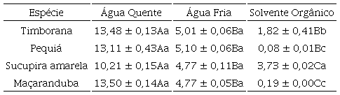Observou-se que no método de extração com água quente obteve-se maiores percentuais de extrativos seguido do método com água fria (Tabela 1), no entanto, em ambos os métodos não houve diferenças nas quantidades de extrativos entre as espécies analisadas. Já utilizando solvente orgânico, obteve-se maiores percentuais de extrativos para madeira da sucupira amarela.