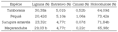 Para a composição química das quatro espécies amazônicas (Tabela 2), os teores de lignina, extrativos, cinzas e holocelulose apresentaram-se em proporções distintas. Na madeira de timborana observou-se o maior percentual de lignina, seguido das madeiras de maçaranduba, sucupira amarela e pequiá. As madeiras de pequiá e timborana apresentaram os maiores valores para extrativos e cinzas, nessa ordem. Apenas nas madeiras de sucupira amarela e pequiá registrou-se valores de holocelulose acima de 70%.