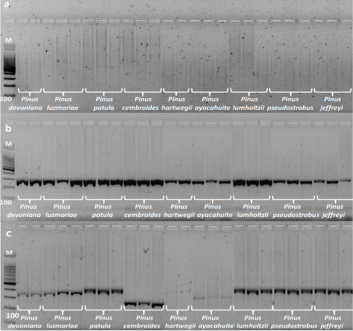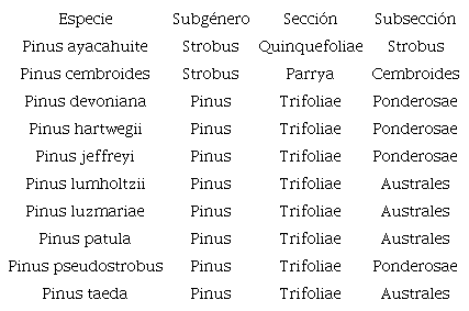 Para la extracción de ADN, se emplearon las acículas de nueve especies del género Pinus: P. cembroides Zucc. (San José de Gracia, Aguascalientes), P. devoniana Lindl. (Tapalpa, Jalisco), P. luzmariae Pérez de la Rosa (Bosque La Primavera, Jalisco), P. patula Schltdl. & Cham. (Cruz Blanca. Veracruz), P. ayacahuite C. Ehrenb. ex Schltdl. (San Antonio Buenavista, Puebla), P. hartwegii Lindl. (Tapalpa, Jalisco), P. jeffreyi Balf. (Ejido Sierra de Juárez, Baja California), P. lumholtzii B.L. Rob. & Fernald (Sierra Escondida, Aguascalientes) y P. pseudostrobus Brongn (San Cristóbal de las Casas, Chiapas). El proceso de extracción de ADN se realizó basado en el método de CTAB (bromuro de hexadeciltrimetilamonio) a partir de tejido liofilizado. Para las primeras cuatro especies se empleó la misma metodología que Saghai-Maroof, Soliman, Jorgensen y Allard, (1984); para el resto de las especies se siguió la metodología establecida por Huang, Guang, Kong, Guo y Guo, (2013). La concentración y calidad del ADN fue determinada mediante espectrofo-tometría (NanoDrop 2000, Thermo Scientific) y corroborada mediante electroforesis en geles de agarosa, comparando el patrón de migración de las muestras con el del marcador de referencia, lambda sin cortar (New England Biolabs). Se emplearon tres árboles para cada especie, excepto para las especies P. devoniana Lindl. y P. hartwegii Lindl, para las cuales solamente se emplearon dos árboles.