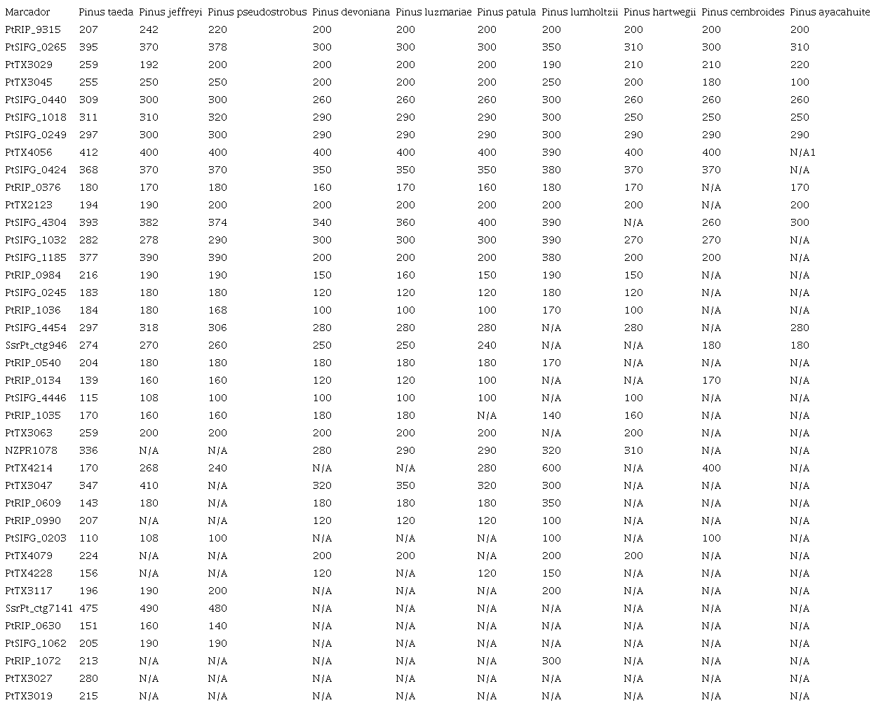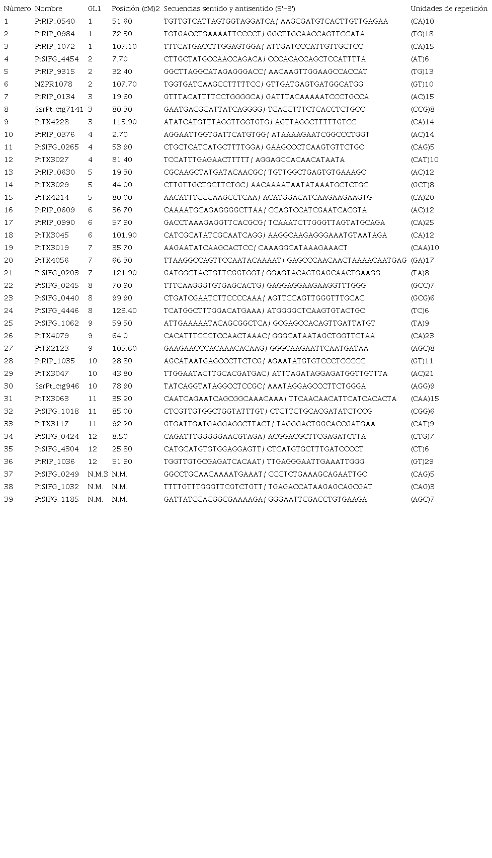 Se realizó la selección de los marcadores de SSR desarrollados para P. taeda (Echt et al., 2011) con base en tres criterios: a) por grupo de ligamiento (GL) (marcadores distribuidos en todos los grupos de ligamiento de las especies del género Pinus), b) motivo de repetición (marcadores con repetición simple de dos o tres nucleótidos) y c) posición genética dentro de cada GL (marcadores ubicados en el brazo corto y largo). Se seleccionaron 39 marcadores, tres por cada uno de los 12 grupos de ligamiento y tres marcadores que no tienen asignación reportada (Tabla 1).