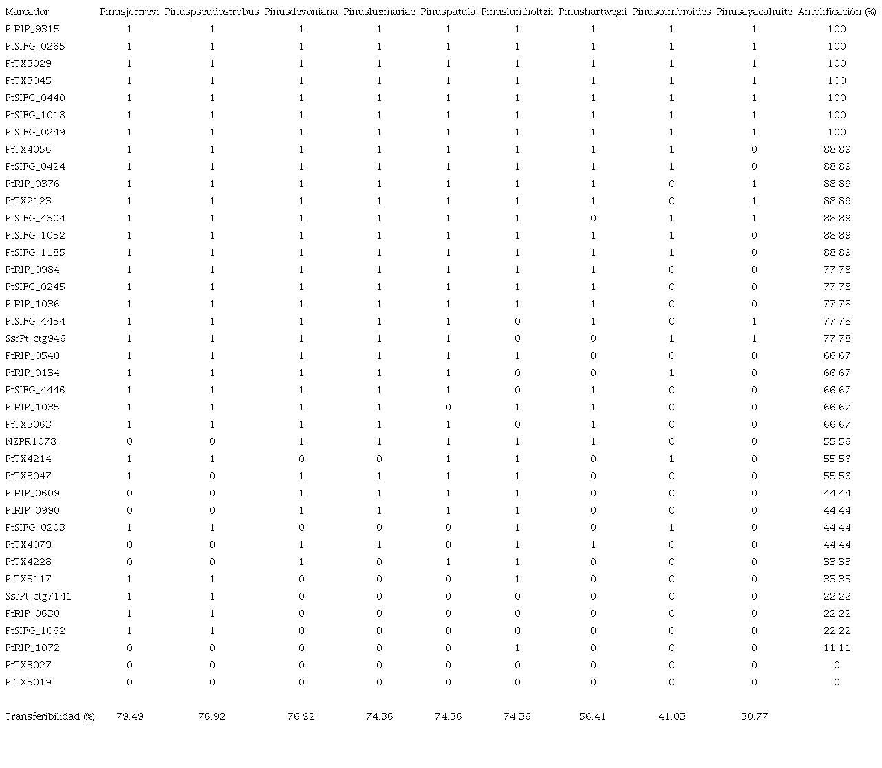 Se observó un porcentaje de amplificación mayor a 30% en todas las especies. El mayor porcentaje de transferibilidad se observó en P. jeffreyi con 31 marcadores (79.49%), seguido de P. devoniana y P. pseudostrobus con 30 marcadores (76.92%). P. luzmariae, P. patula y P. lumholtzii, por otro lado, mostraron amplificación de 29 marcadores (74.36%), mientras que P. hartwegii, P. cembroides y P. ayacahuite mostraron amplificación en 22 (56.41%), 16 (41.03%) y 12 (30.67%) marcadores, respectivamente. Siete especies analizadas en el presente estudio tuvieron una transferibilidad de marcadores SSR mayor a 50%. Estas especies, así como P. taeda, pertenecen a la sección Trifoliae del subgénero Pinus. Por el contrario, las especies con menor transferibilidad (P. ayacahuite y P. cembroides) pertenecen al subgénero Strobus secciones Quinquefoliae y Parrya, respectivamente, siendo filogenéticamente más lejanas a P. taeda (Tabla 3). Las regiones complementarias de los iniciadores pudieron haber sufrido algún evento mutacional que impidió en ellos el proceso de hibridación durante el proceso de amplificación por PCR, con la consecuente ausencia de ampliaciones (Chapuis y Estoup, 2007).