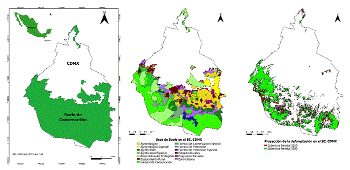 La Ciudad de México (CDMX) se subdivide en dos grandes categorías con relación al uso del suelo: área urbana y Suelo de Conservación (SC) (Procuraduría Ambiental y del Ordenamiento Territorial [PAOT] y Secretaría del Medio Ambiente [Sedema], 2012). El SC comprende un territorio de 88 554 ha ubicado mayoritariamente en la parte periférica sur y el sur-poniente de la ciudad (Fig. 1). Esta categoría fue establecida en 1996 por la Ley de Desarrollo Urbano del Distrito Federal y refrendada en el 2000 por el Programa General de Ordenamiento Ecológico del Distrito Federal, delimitando las políticas, los instrumentos y los aprovechamientos que se pueden llevar a cabo (Gaceta Oficial del Distrito Federal [GODF], 1996, 2000). Desde entonces, en el SC se han aplicado múltiples acciones y programas encaminados a la preservación ecológica, la producción rural y el desarrollo sustentable, a través de los proyectos de la Secretaría del Medio Ambiente, entre otras instituciones [Sedema, 2002].
