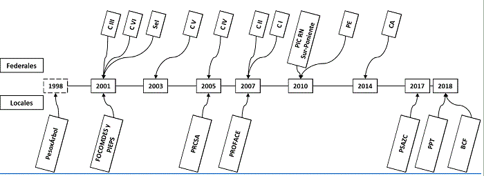 La línea de tiempo de los programas de conservación ambiental (los IDC) implementados en el SC de la CDMX desde el año 2000, se presenta en la figura 2. Para conocer a mayor detalle la historia de la aplicación de los instrumentos de la política pública ambiental en el SC, la evolución de los componentes de la Conafor, así como los objetivos, beneficiarios y algunas críticas sobre los programas a escala local se puede consultar el suplemento 1. En forma de síntesis, se puede decir que en el SC se han implementado diversos instrumentos económicos enfocados a la preservación de los SE desde ámbitos gubernamentales federal (incluyendo fondos mixtos) y local, los que se comentan a continuación.