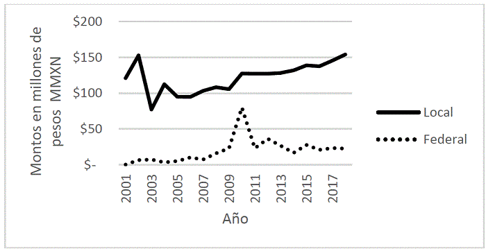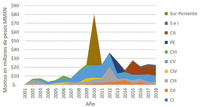 Por el lado local, destacan los apoyos otorgados por el PICRN sur-poniente con un aporte mayor a MMXN 57, cantidad relevante para un apoyo que solamente fue otorgado durante el año 2010. También destaca el programa de CA, con aporte de MMXN 45 y que fue puesto en marcha durante el periodo 2014-2018.