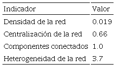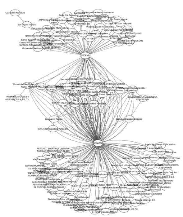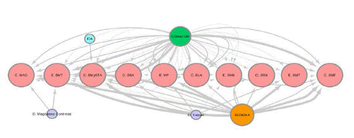 La primera red presenta todos los actores y relaciones a lo largo del periodo de estudio (Fig. 6). Respecto a los indicadores globales de la red (Tabla 4), la densidad indica poca interconexión entre los nodos vecinos, lo que significa que hay pocas fuentes de financiamiento y no hay flujo económico entre las comunidades. La centralización muestra que es una red muy compacta, centrada en unos cuantos nodos, donde pocos actores poseen gran poder sobre el destino de los apoyos. Componentes conectados indican que no hay actores independientes y en la heterogeneidad de la red se pueden distinguir cuatro subconjuntos de las comunidades: 1) las que reciben apoyos únicamente de la Conafor, 2) las que reciben apoyos mixtos de Conafor con instancias privadas, 3) los que reciben apoyos únicamente de la Sedema, 4) las que reciben apoyos de ambas instituciones (Conafor y Sedema).