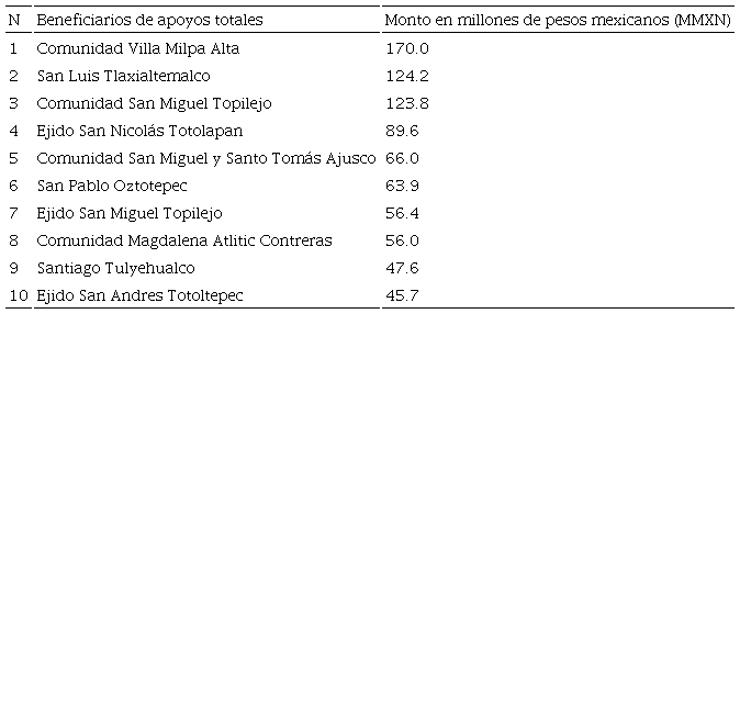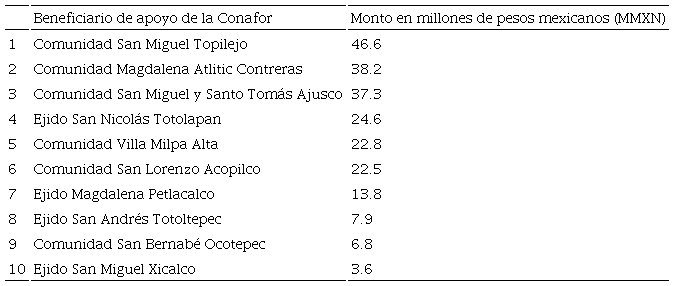 Entre los núcleos agrarios que más recibieron apoyos de la Conafor se encuentran las comunidades de San Miguel Topilejo, San Miguel y Santo Tomás Ajusco y de Magdalena Contreras (Tabla 1). Es importante señalar que los apoyos federales no se restringen a núcleos agrarios como receptores de subsidios, sino también incluyen a individuos, grupos de trabajo, sociedades de producción rural, asociaciones civiles, empresas privadas, áreas naturales protegidas y alcaldías. En algunos casos, se ubicaron montos percibidos por individuos, pero se consideraron como apoyos destinados a núcleos agrarios por tratarse de los comisariados de las comunidades de Villa Milpa Alta y de San Lorenzo Acopilco.