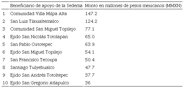 Respecto a los apoyos económicos recibidos por hectárea del bosque en el SC de la CDMX, los montos varían entre MXN 800 ha año-1 a MXN 13 000 ha año-1 entre las diez comunidades más beneficiadas, con un valor promedio de MXN 6000 ha año-1. Los receptores de más apoyos por hectárea forestal han sido el ejido de San Miguel Xicalco y las comunidades San Bernabé Ocotepec y Santiago Tepalcatlalpan.