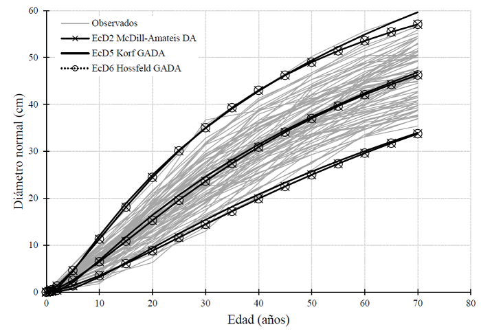 Sin embargo, un comparativo mediante inspección visual sobre el comportamiento gráfico respecto a las tendencias que cada ecuación describe determinó que las ecuaciones EcD2, EcD5 y EcD6 se sobreponen de mejor manera a las tendencias de los datos observados, sobre todo en los extremos superior e inferior de los valores de Dn en todo el intervalo de edad analizado (Fig. 1). Las ecuaciones EcD1 y EcD4 generaron curvas de crecimiento con tendencia a subestimar en forma acentuada en el extremo superior de edad observado; en cambio, las curvas que generó la EcD3 tendieron a sobreestimar en ese mismo extremo de edad, separándose marcadamente de las tendencias observadas en los límites superior e inferior del diámetro normal.