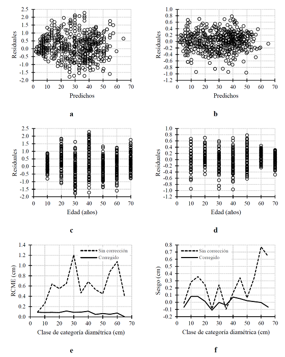 La calidad de ajuste de la ecuación dinámica corregida por autocorrelación y heterocedasticidad se comparó contra el ajuste sin corregir, se usaron los estadísticos: coeficiente de determinación ajustado (R2adj), logaritmo de verosimilitud (logLik), comportamiento gráfico del sesgo y de la raíz del cuadrado medio del error (RCME) por clase diamétrica, así como una inspección visual de los residuales contra los predichos y la edad.