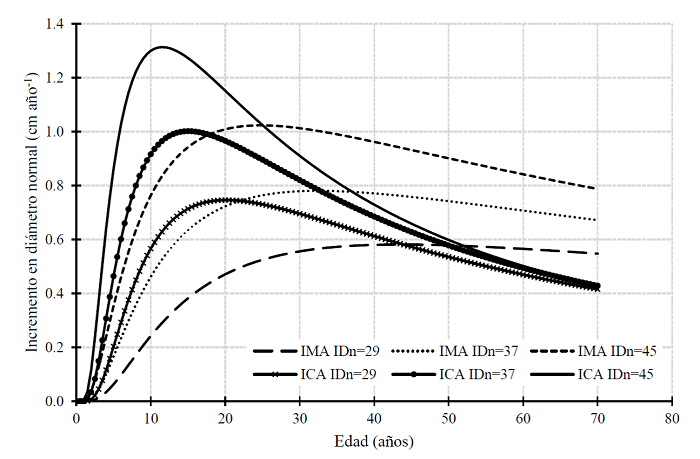 Las expresiones 7, 8, 9 y 10, cuyos componentes 𝑋0, 𝑅0 y 𝐿0 se indican en la tabla 2, fueron derivadas de la EcD5 para estimar y construir curvas de incremento corriente anual (ICA), de ICA máximo (ICAmáx), de incremento medio anual (IMA) y de IMA máximo (IMAmáx), respectivamente (Fig. 4). Con base en estas, se determinó que el ICAmáx en Dn para árboles de P. montezumae es de 0.75 cm año-1, 1.00 cm año-1 y 1.31 cm año-1 para los IDn bajo, medio y alto, respectivamente, en todos los casos corresponde a un Dn de 9.33 cm, mismo que se alcanza a los 19.9 años, 14.8 años y 11.3 años, respectivamente. En tanto, el IMAmáx es de 0.58 cm, 0.78 cm y 1.02 cm para los IDn referidos, que corresponden a 25.37 cm de Dn, el cual se alcanza a los 43.64 años, 32.51 años y 24.79 años, respectivamente.