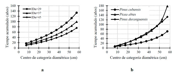 El comportamiento gráfico del tiempo acumulado de los TP por IDn para P. montezumae sugiere que la tendencia es no lineal (Fig. 5a); este aspecto es importante a tomar en cuenta al momento de realizar extrapolaciones en el TP de categorías diamétricas inferiores a superiores, ya que generalmente se adopta el supuesto de que el crecimiento del Dn es lineal entre categorías consecutivas, situación que pueden provocar un sesgo importante en la determinación del TP.