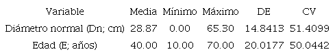 Se utilizó información de diámetro normal sin corteza (Dn = Y; cm) y edad (E = t; años) generada de una muestra de 81 árboles de Pinus montezumae colectada en predios forestales de la unidad de manejo referida. Los árboles seleccionados fueron dominantes y codominantes en altura, libres de defectos, sanos y de fuste recto; incluyeron diferentes categorías de diámetro normal y de altura total y cubrieron diferentes calidades de estación.