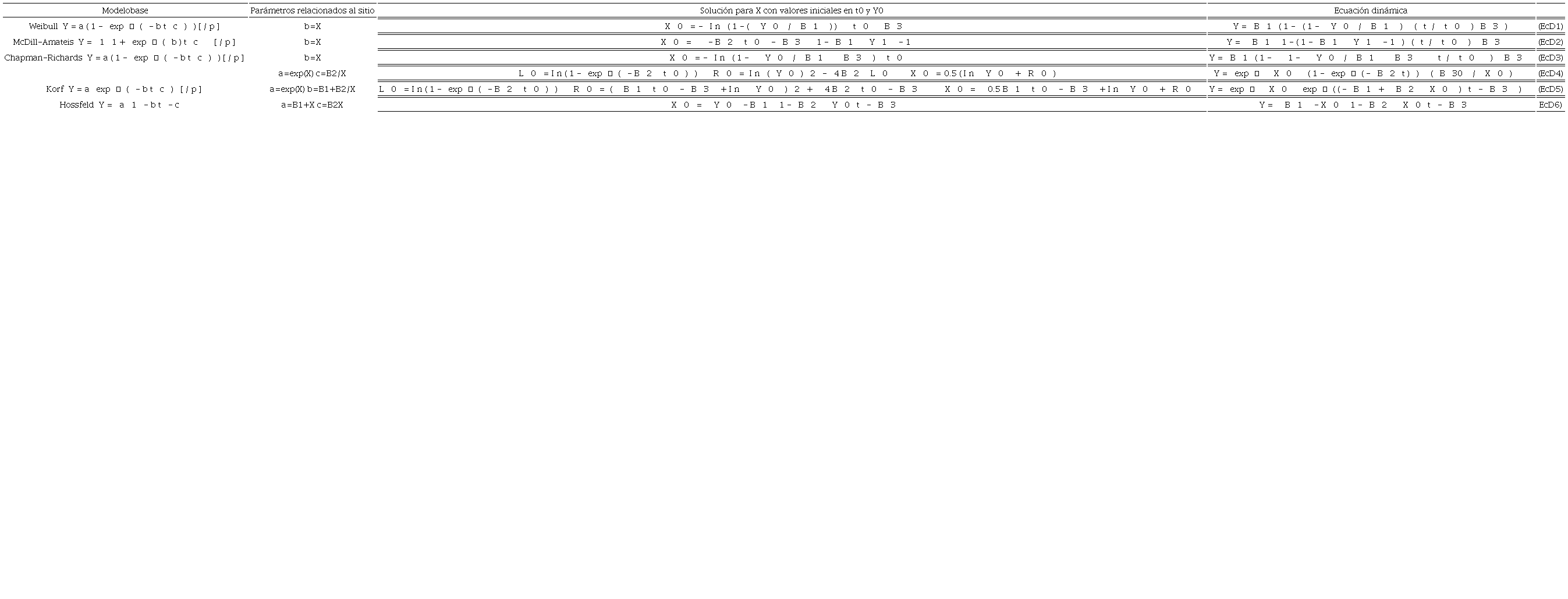 A los pares de datos se ajustaron, por regresión estadística, seis ecuaciones dinámicas (EcD) que en un análisis previo resultaron plausibles (Tabla 2), las cuales fueron generadas al aplicar el enfoque de la diferencia algebraica generalizada (DAG) (Cieszewski y Bailey, 2000). Las primeras tres ecuaciones generan curvas polimórficas y son equivalentes al enfoque de diferencia algebraica (DA) (Bailey y Clutter, 1974); para las últimas se combinan las hipótesis de que tanto la tasa de crecimiento como el potencial máximo de crecimiento varían entre sitios, lo que da lugar a curvas de crecimiento polimórficas con asíntotas variables.