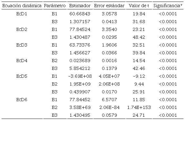 Los parámetros en todas las ecuaciones dinámicas fueron significativamente diferentes de cero (p < 0.05) (Tabla 3); aunque todos los ajustes son aceptables, en esta primera instancia es prematuro seleccionar alguna EcD en particular para estimar el crecimiento en Dn.