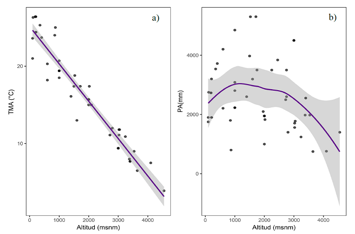 Las PA varían con la altitud, alcanzando máximos pluviales de 5302 mm a los 1713 m (Oliveras et al., 2020) y de 5300 mm a los 1527 m (Bahar et al., 2017); el mínimo pluvial registrado fue de 760 mm entre altitudes de 4100 m y 4400 m (Llambí et al., 2020). En la Fig. 1b se observa el comportamiento de la PA de 0 m a más de 4000 m de altitud, mostrando una tendencia decreciente a partir de las máximas PA; sin embargo, con respecto a la TMA presentan disminución térmica lineal por el aumento de la altitud en el gradiente altitudinal (Fig. 1a). La disminución térmica por cada 100 m de incremento de la altitud, entre 2865 m y 3550, m fue de -0.48 °C (Wang Yang, Deslauriers y Bräuning, 2014); entre 1952 m y 3 550 m, fue de -0.65 °C (Wilcke et al., 2008); entre 0 m y 2249 m, fue de -0.56 °C (Rolland, 2003); entre 600 m y 1400 m fue de -0.52 °C (Wang, Chou, Chiou, Tian y Chiu, 2016); y entre 400 m y 1000 m fue de -0.44 °C. Lo anterior denota influencia de las bajas temperaturas en la diferenciación de la vegetación (Blum, Roderjan y Galvão, 2011).
