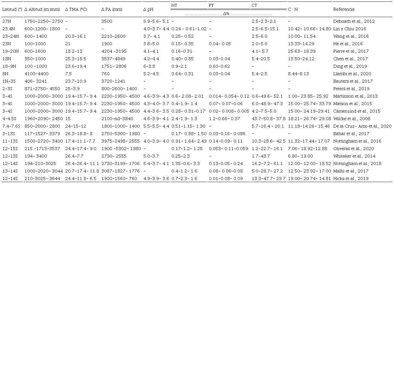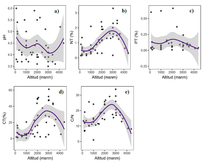El comportamiento de la relación C/N depende del CT y NT, que en el gradiente altitudinal en altitudes entre 0 m y 3000 m se incrementa con el aumento de la altitud, sin embargo, sobre esta altitud disminuye (Fig. 2e). El aumento entre 0 m y 3000 m y la disminución sobre los 3000 m de altitud de la relación C/N corresponden a diferentes investigaciones (Wilcke et al., 2008; Martinson et al., 2013; Whitaker et al., 2014; Matson et al., 2015; Camenzind et al., 2015; Lin et al., 2016; Wang et al., 2016; He et al., 2016; Nottingham et al., 2016; Chen et al., 2017; Malhi et al., 2017; Nottingham et al., 2018; Hicks et al., 2019; Peters et al., 2019; Oliveras et al., 2020; De la Cruz-Amo et al., 2020; Llambí et al., 2020. ), a excepción de Pierre et al. (2017), quienes determinaron que, en un gradiente altitudinal de 600 m a 1600 m, la relación C/N disminuye con valores de 25.63 y 18.39 respectivamente. En un gradiente altitudinal de 1000 m a 3000 m, la descomposición de la materia orgánica es mayor a menores altitudes, debido a la mayor presencia de microrganismos favorecidos por la baja relación de C/N (Baldos et al., 2015). En consecuencia, se puede afirmar que a menores valores de la relación C/N, mayor es la descomposición de la materia orgánica en el suelo, por lo tanto, existe mayor disponibilidad de nutrientes para las plantas, lo que origina suelos fértiles y profundos con mayor diversidad de flora y fauna en altitudes inferiores; ocurre lo contrario en altitudes superiores (Fig. 2e).