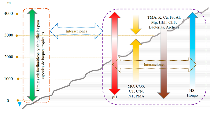Con respecto a K, Ca, Fe, Al y Mg en el suelo, los estudios indican que estos elementos disminuyen con el aumento de la altitud en el gradiente altitudinal de bosques tropicales (Fig. 3). El K disminuyó de 0.23% a 0.01% entre 1000 m y 3000 m (Camenzind et al., 2015); de 0.31% a 0.11% entre 1960 m y 2450 m (Wilcke et al., 2008). El Ca disminuyó de 0.6 mg g-1 a 0.2 mg g-1 entre 350 m y 1000 m (Chen et al., 2017); y de 0.38 mg g-1 a 0.10 mg g-1 y a 0.14 mg g-1 entre 1000 m, 2000 m y 3000 m (Camenzind et al., 2015); y de 3.6 mg g-1 a 0.18 mg g-1 entre 1960 m y 2450 m (Wilcke et al., 2008). El Fe disminuyó de 12.1 mg g-1, 0.2 mg g-1 y 0.1 mg g-1; el Al disminuyó de 40.3 mg g-1, 0.8 mg g-1 y 0.4 mg g-1; y el Mg disminuyó de 0.93 mg g-1, 0.12 mg g-1 y 0.09 mg g-1, entre 1000 m, 2000 m y 3000 m, respectivamente (Camenzind et al., 2015). La tendencia de disminución de los nutrientes en el suelo se asociada con las bajas TMA, mayor humedad del suelo y altas concentraciones de compuestos fenólicos que ralentizan la descomposición y mineralización de la metería orgánica en gradientes altitudinales más altos (Wilcke et al., 2008). Haciendo estas consideraciones se deduce que las especies forestales a mayor altitud están sometidas a complejos límites edafoclimáticos y altitudinales (Fig. 3), lo cual favorece que prosperen especies rústicas o endémicas, con disminución de la diversidad.
