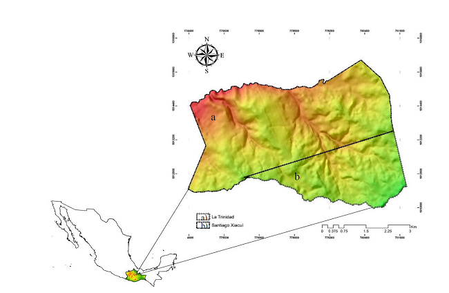 El estudio se realizó en los núcleos agrarios de Santiago Xiacuí y la Trinidad, Ixtlán, en la Sierra Norte de Oaxaca (Fig. 1) que cuenta con una superficie total de 2660.32 ha (Registro Agrario Nacional [RAN] 2005) de las cuales, 2376 ha están destinadas al manejo forestal, divididas a su vez en producción (1847.94 ha) y protección (423 ha). La vegetación predominante en el área de estudio es pino-encino y encino-pino (P. patula, P pseudostrobus, Q. laurina, Q. crassifolia) (Uzachi, 2014). El suelo dominante en la zona es Cambisol (Instituto Nacional de Estadística y Geografía [Inegi] 2013) y el clima es subhúmedo con lluvias en verano C (w1)(w)b(i’). La precipitación media anual varía entre 900 mm y 1700 mm, la temperatura media anual es de 18 °C (Clark-Tapia, Suárez-Mota, Matías-Nolasco y Velasco-Hipólito, 2016).