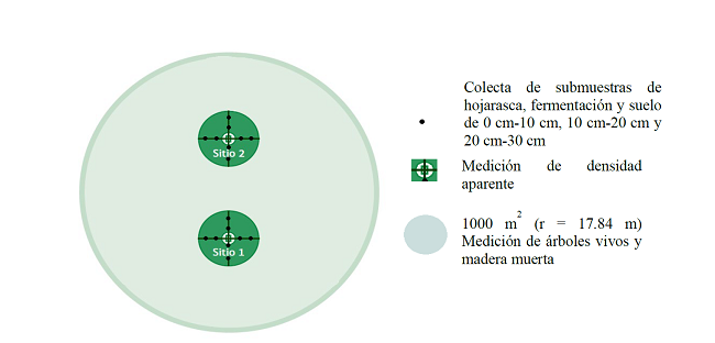 Para la toma de datos se realizó una modificación a la metodología propuesta por el Inventario Forestal y de Suelos (Comisión Nacional Forestal [Conafor] 2011), debido a que las parcelas de estudio fueron más pequeñas que las sugeridas en dicha metodología. En cada sistema de manejo forestal se escogió un sitio de 1000 m2 con forma circular y radio de 17.84 m, los sitios fueron únicos, debido a que no se encontraron más condiciones similares, el área de muestreo abarcó la totalidad del sitio de estudio. Existen estudios sobre almacenes de C y flujos de CO2 en los que también se establecieron sitios únicos de 400 m2 y 0.6 ha respectivamente (García-Oliva et al., 2014; O’Dell et al., 2015).