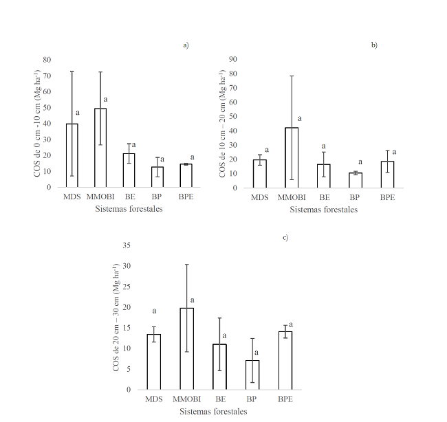 En el presente estudio presentamos un análisis clúster que mostró disimilitud entre sistemas forestales (Fig. 4), lo que hace suponer, si se considera el estrato 0 cm-30 cm de profundidad del perfil, que el manejo MMOBI presenta tendencia a acumular mayor contenido de C en el suelo que los otros sistemas evaluados. En el caso de los sistemas manejados, cuando existe tala de árboles y se deja el material residual en el terreno, se provoca una aceleración de la tasa de retorno del C al suelo (Saynes et al., 2012). En el sistema MMOBI se generaron 1.76 Mg C ha-1 de material leñoso esparcido de forma homogénea sobre el suelo, en este sistema las prácticas silvícolas como chapeo, podas y aclareo utilizadas son con intensidad mínima o incluso algunas no se utilizan, lo cual favorece la acumulación de material residual sobre el suelo, y, por ende, el aumento del almacén de C en el mantillo (Fig. 3 y Fig. 5). En contraste con el sistema MMOBI, el sistema MDS contiene 1.43 Mg C ha-1 de material leñoso sobre el suelo acomodado en forma de montículos y curvas de nivel con prácticas de quema para el material excedente, lo cual genera mayor apertura del dosel, que favorecería el desarrollo de organismos descomponedores que fomentan la mineralización en el suelo (Vesterdal et al., 2002). Se ha demostrado que, cuando se aplican manejos en los que se mantiene la cubierta forestal simulando un compor-tamiento natural, existe mayor almacenamiento de COS (Thornley y Cannell, 2000; Hoover, 2011).