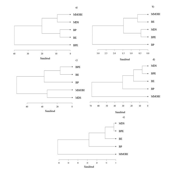 Después de 21 años de manejo silvícola con alta (MDS) y baja intensidad (MMOBI), se encontró que el contenido de C en el suelo en la capa 0 cm - 30 cm, fue similar (p > 0.05) en comparación con bosques no manejados de BPE, BP y BE, aun cuando los primeros tienen manejo forestal (Tabla 1). Tampoco hubo diferencias estadísticas significativas (p < 0.05) entre los diferentes incrementos de profundidad (0 cm-10 cm, 10 cm-20 cm y 20 cm-30 cm) (Fig. 3). Sin embargo, el resultado del análisis clúster mostró que había tanto similitudes como divergencias entre los manejos (Fig. 4). En el estrato 0 cm - 10 cm de profundidad del suelo, se identificaron dos grupos divergentes acordes con la línea de corte. En uno se agrupan los tratamientos MMOBI y MDS con los contenidos más altos de C con respecto al otro grupo, donde se encuentran los tratamientos BPE, BE y BP. Sin embargo, dentro de este último se observaron divergencias, pues el BP mostró menor contenido de C respecto a BPE y BE (Fig. 4). Es así como el bosque manejado con MMOBI con mayor contenido de C en el suelo presentó 3.8 veces más que el suelo del BP con el menor contenido de C. Según los resultados del análisis clúster, en los incrementos de profundidad del suelo 10 cm-20 cm y 20 cm-30 cm los manejos forestales, acorde con los contenidos de C en el suelo, se agruparon de manera similar, conformándose dos grupos disímiles, uno representado por el tratamiento MMOBI, el cual tuvo los mayores contenidos de C (4 veces más respecto al mínimo valor del BP), y otro con el resto de los tratamientos (Fig. 4). Al igual que de 0 cm-10 cm, el bosque de pino se disoció dentro del grupo y fue el que presentó el menor contenido de C en el suelo (Fig. 4). Considerando la tendencia de MMOBI en las tres profundidades de muestreo, se podría suponer un mayor potencial de almacenamiento de C en el suelo con respecto al manejo MDS y a los bosques no manejados.