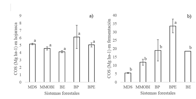 El horizonte de fermentación del BPE presentó el mayor contenido de C de los sistemas analizados (Fig. 5), superior al observado en bosques vecinos de PE sin manejo (10.6 Mg C ha-1 y 17 Mg C ha-1) (Galicia, Saynes y Campo, 2015) o con manejo forestal (23.4 Mg C ha-1 y 29.6 Mg C ha-1 (Acosta-Mireles, Carrillo-Anzures y Díaz-Lavariega, 2009). Esto último se asocia al ser un bosque sucesionalmente más desarrollado, con edades de 40 años-100 años, lo que favorece la producción de biomasa viva y la caída de hojas (Berg y McClaugherty, 2008), al incrementarse la acumulación de mantillo (hojarasca y horizonte de fermentación). El BPE se estructura con especies de Pinus, Quercus y otras latifoliadas, la mayoría de las especies son caducifolias, lo que favorece el almacenamiento del mantillo, con un espesor de 5 cm-7.5 cm. Aunado a esto está también la prevalencia de especies de Quercus y Pinus que aportan compuestos recalcitrantes, como la lignina (Hector, Beale, Minns, Otway y Lawton, 2000), que inhiben la actividad microbiana por compuestos secundarios como taninos o fenoles (Hättenschwiler y Vitousek, 2000), por lo cual la relación C:N (29.4) se asocia a una degradación lenta (Duchaufour, 1984). El MDS, fue el sistema con el menor contenido de C en la capa de fermentación, asociado al menor espesor de la capa (3.5-6.5) atribuido a lo joven del bosque (21 años) en comparación al BPE.