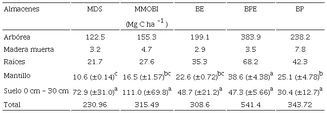 Destaca que el sistema MMOBI, a pesar de que sea manejado, presentó contenidos de C mayores al BE y similares al del BP, resaltando su mayor capacidad de almacenamiento. En contraste, el bosque manejado con MDS presentó los menores contenidos de C total debido probablemente a la menor densidad de árboles (Tabla 2) que redituó en menor biomasa aérea y raíces. En dicho sistema sobresalen las especies comerciales P. patula y P. pseudostrobus, con densidades de madera menores a Quercus y otras latifoliadas. El incremento de estas especies, como parte del manejo forestal de alta intensidad ha generado cambios en la estructura de la vegetación y, en consecuencia, en los almacenes de C (Ríos-Altamirano et al., 2016).