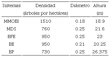 Los bosques no manejados presentaron los mayores contenidos de C en biomasa área, BPE > BP > BE que los bosques manejados, siendo el bosque manejado con MMOBI el que mostró el mayor contenido de C (Tabla 1). Este resultado no parece estar relacionado con la densidad arbórea, ya que la mayor densidad entre todos los sistemas forestales de estudio se presentó en el bosque manejado con MMOB; tampoco parece estar relacionado con la altura y el diámetro de los árboles cuyos mayores valores se registraron en el bosque de pino (Tabla 2).