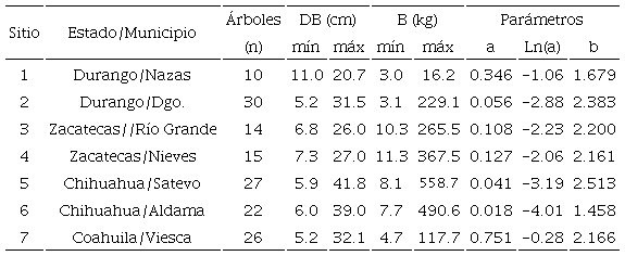 Los registros del diámetro basal (cm) y biomasa (kg) se obtuvieron de Turlan-Medina (2011), los cuales ajustaron ecuaciones potenciales de Prosopis laevigata para siete sitios en el Norte de México (Méndez-González et al., 2012) (Fig. 1). La tabla 1 presenta un resumen de las principales características de los sitios de muestreo. El número total de árboles observados en los sitios fue de 144, donde cada dato representa el diámetro basal (Db) y la biomasa (B). Los parámetros a y b se ajustaron con el método de mínimos cuadrados mediante una ecuación transformada a logaritmo para hacerla lineal.