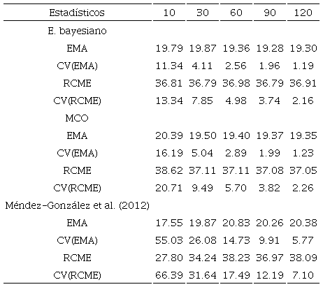 La tabla 2 presenta los resultados promedios en la validación del EB, MCO y los valores ajustados por Méndez-González et al. (2012) en las diferentes muestras y 1000 repeticiones analizadas. La validación se realizó transformando las predicciones de la ecuación (1) a su escala original. La incertidumbre promedio de EMA y RCME del error fue similar para los tres enfoques propuestos y los diferentes tamaños de muestra. Sin embargo, se observó que a medida que el tamaño de muestra disminuyó, el coeficiente variación de EMA y RCME aumentó proporcionalmente en los tres métodos. La figura 4 muestra la incertidumbre de cada método, donde se observó que el enfoque bayesiano es el más estable, aunque el MCO mostró una tendencia similar, pero con mayores valores atípicos. Al usar el ajuste de Méndez-González et al. (2012) se observó que en TM de 10 árboles, su porcentaje de error en comparación con el EB fue de 497.6%. En el caso de MCO el porcentaje de error fue de 55% con respecto a EB. Se necesitan entre 90 y 120 árboles del ajuste de Méndez-González et al. (2012) para obtener CV similares al EB, que lo obtiene con tan solo 10 individuos. Al mantener la incertidumbre del error más baja en los diferentes tamaños de muestra, se determinó que el EB es mejor para aplicarse en TM grandes o pequeños.