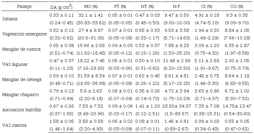De acuerdo con la tabla 1, los humedales terrestres se encontraron distribuidos en el gradiente de tierra a mar en niveles topográficos entre negativos y positivos. Esto indica que se presentaron algunos sitios con inundación permanente como los pastos marinos, mientras que en otros las fluctuaciones fueron frecuentes (manglares chaparros y manglar de ciénega), periódicas (manglar de cuenca y vegetación emergente) o estacionales (sabana).