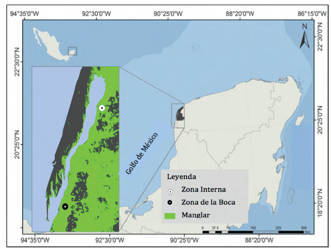 El manglar de franja de Celestún, que se desarrolla en el escenario geomorfológico de laguna costera cárstica y que está sometido al gradiente de salinidad, presenta variaciones en la estructura de la vegetación. En la zona interna hay árboles más altos (11 m) y domina L. racemosa, mientras que en la zona de la boca los árboles son de menor altura (8 m) y domina A. germinans. Sin embargo, la caída de hojarasca no presentó diferencias significativas entre zonas, pero sí entre temporadas, sugiriendo que la variabilidad estacional de la caída de hoja-rasca está relacionada con el contenido de nutrientes en los sedimentos modulado por aportación de agua de marea o subterránea.