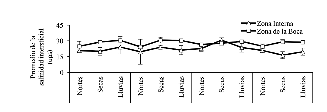 El valor promedio de la salinidad intersticial en la zona interna fue de 22.7 ups ± 6.0 ups, 22.2 ups ± 2.09 ups, 20.9 ups ± 1.1 ups para la temporada de secas, lluvias y nortes respectivamente, no se observaron diferencias significativas entre temporadas (p > 0.05). El valor de salinidad promedio para la zona interna fue de 21.8 ups ± 3.4 ups.